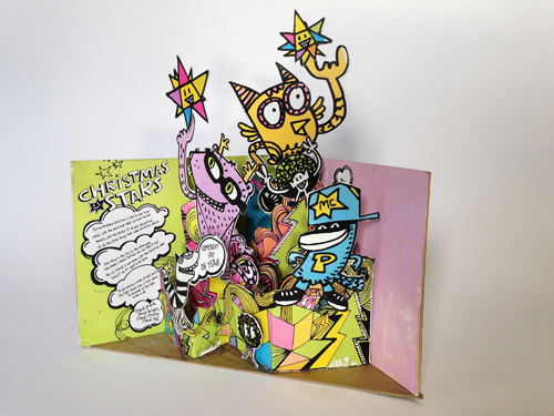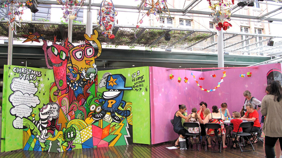 Illustration and concept management for Christmas entertainment in the Queen Street Mall that juxtaposed a hip-hop show, a giant hand made pop-up book and workshop activities for children.
